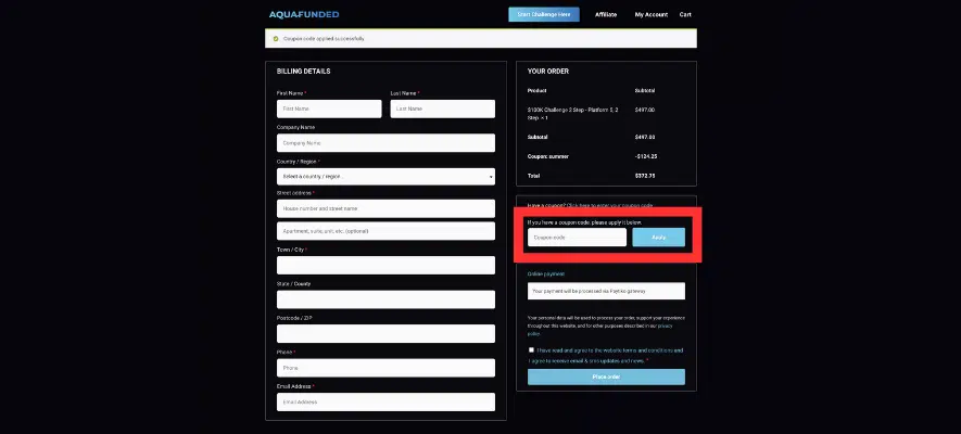 Proceed to the checkout page after selecting your desired challenge. Aqua Funded offers multiple payment methods, including credit/debit cards, PayPal, and bank transfers. Choose the method that best suits your preferences