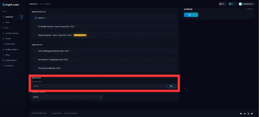 Before you complete your payment, you’ll have the chance to enter your discount code. Paste the code you copied earlier into the designated field on the checkout page. Click the apply button to see the discount reflected in your total amount. If the code is valid, the discount will be applied, and you will see the reduced price. Finish the payment process to confirm your purchase and enjoy your discounted challenge.