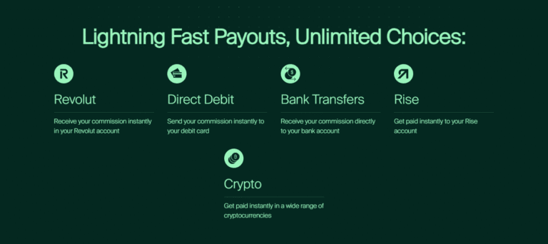 - Multiple payout options – VISA, Mastercard, Revolut, Rise, Bank Transfer, Crypto