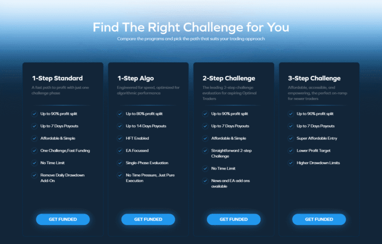 In summary, Optimal Trader is a reputable proprietary trading firm that provides traders with multiple evaluation options designed to suit different trading styles and objectives. Traders can choose from 1-Step, 2-Step, or 3-Step challenges, allowing them to progress at their own pace and become fully funded portfolio managers.