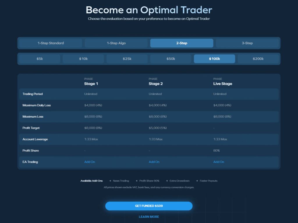 Optimal Trader is a proprietary trading firm that provides skilled traders with access to simulated capital of up to $200,000 and profit splits reaching 90%. The firm offers flexible evaluation models — 1-Step, 2-Step, and 3-Step Challenges — designed to suit different trading styles and risk preferences. Optimal Trader aims to create a transparent and trader-friendly environment, offering access to multiple trading instruments, including forex, indices, commodities, and cryptocurrencies. By focusing on fair trading conditions and professional tools, the firm empowers traders to achieve long-term success.